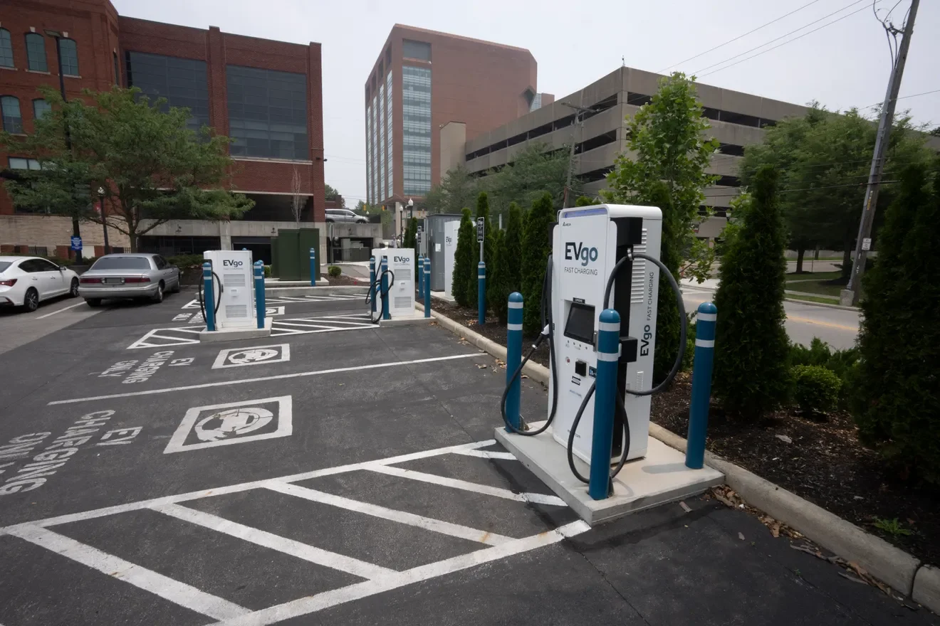 Jun 28, 2023; Columbus, OH, United States; An EVGO charging station near Front Street. Brooke LaValley/Columbus Dispatch